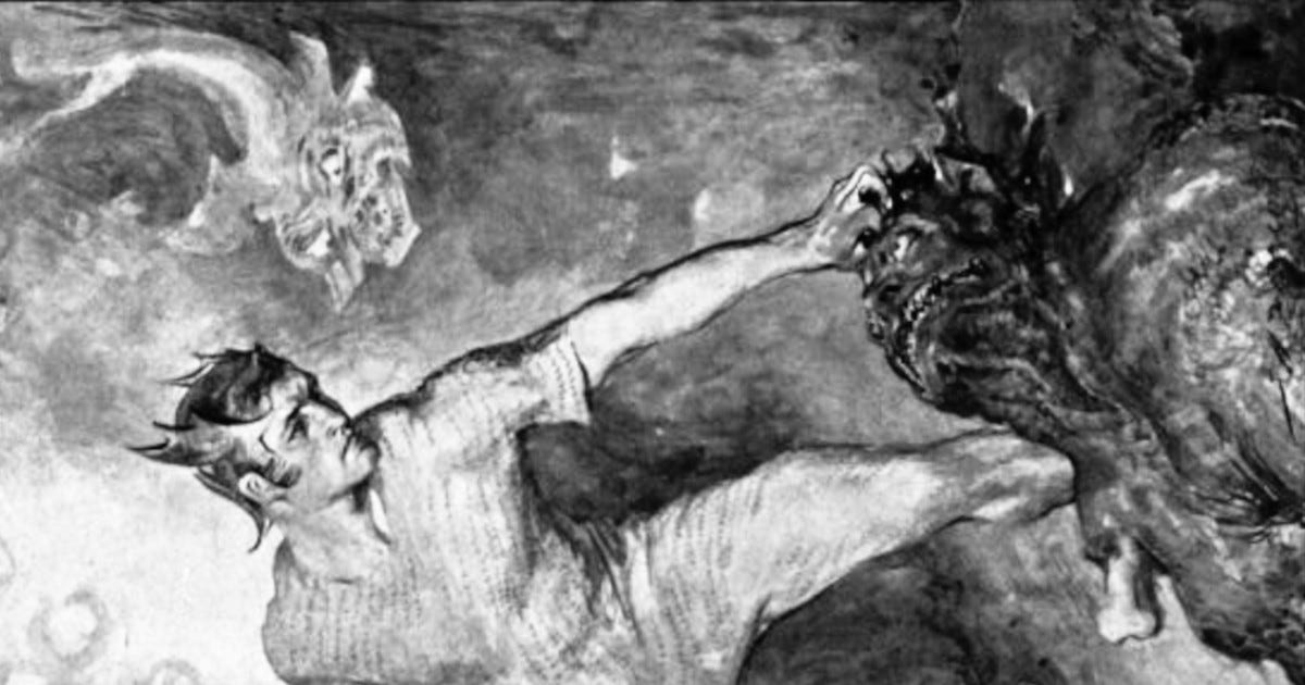J. H. F. Bacon, Beowulf shears off the head of Grendel (~1910); public domain via Project Gutenberg; modified